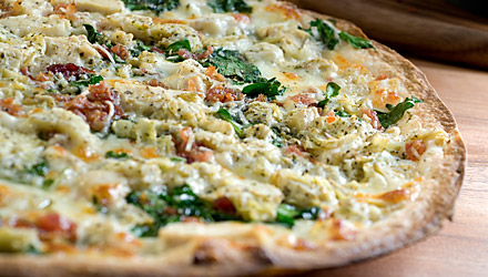 A spicy marinara sauce with sweet Italian sausage, spicy Capicola ham, julienned salami, Fontina, mozzarella and parmesan cheeses, topped with fresh oregano and basil