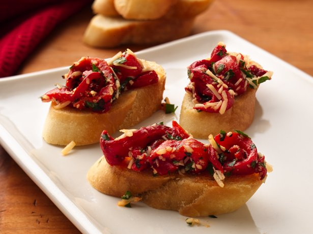Grilled home-baked bread topped with roasted garlic cream, marinated freshly roasted sweet peppers and tomatoes and dusted with Parmeggiano Reggiano